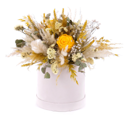 Potešte svojich najbližších kvetinovým boxom, ktorý je aranžovaný z preparovaných kvetov značky In Eterno a sušených doplnkov. Aranžmán obsahuje žlté a biele preparované ruže a prírodné doplnky.