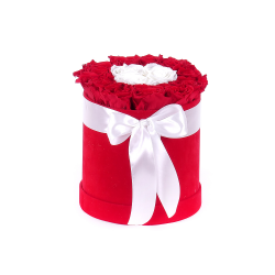 Luxury red round box with preserved red and white roses decorated with white ribbon.